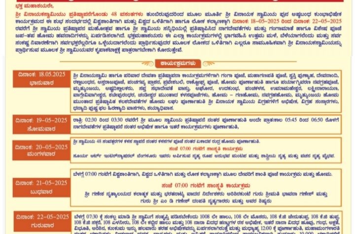 ಭಕ್ತ ಮಹಾಶಯರೇ, ಶ್ರೀ ವಿನಾಯಕಸ್ವಾಮಿಯು ಪ್ರತಿಷ್ಠಾಪನೆಗೊಂಡು 48 ವಸಂತಗಳು ತುಂಬಿರುವುದರಿಂದ ಮೂಲ ಮೂರ್ತಿ ಶ್ರೀ ವಿನಾಯಕಸ್ವಾಮಿಯ ಪುನಃ ಅಷ್ಟಬಂಧ...
