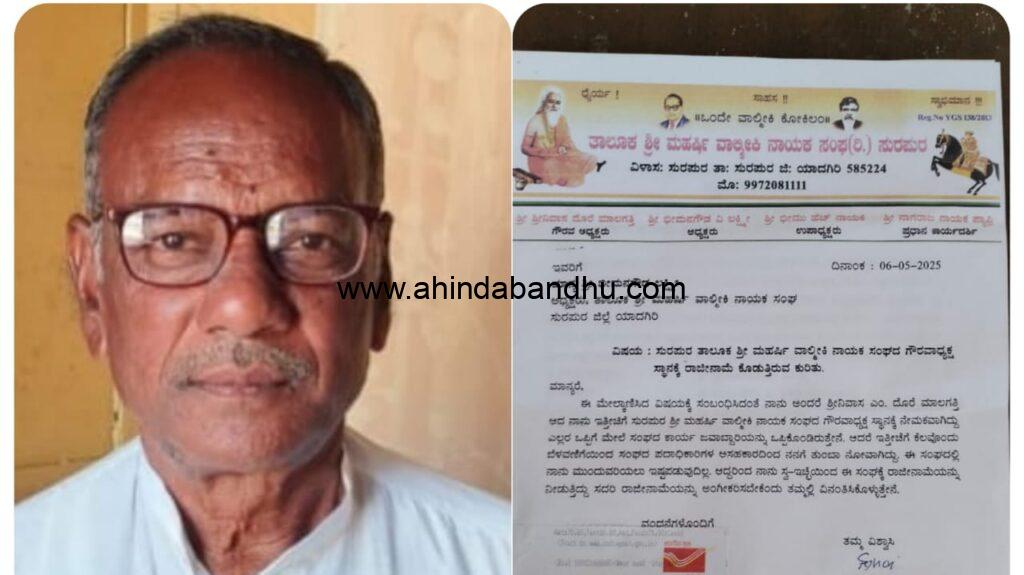 ಯಾದಗಿರಿ ಜಿಲ್ಲೆ ಸುರಪುರ ತಾಲೂಕಿನ ಶ್ರೀ ಮಹರ್ಷಿ ವಾಲ್ಮೀಕಿ ನಾಯಕ ಸಂಘದ ಗೌರವಧ್ಯಕ್ಷರ ಸ್ಥಾನ ಕಾರ್ಯನಿರ್ವಹಿಸುತ್ತಿರುವ ನಾನು ಸಂಘದ ಪದಾಧಿಕಾರಿಗಳ ಅಸಹಕಾರದಿಂದ ನನಗೆ ನೋವು ಉಂಟಾಗಿದ್ದು ಆದ್ದರಿಂದ ಈ ಗೌರವಾಧ್ಯಕ್ಷ ಸ್ಥಾನಕ್ಕೆ ನನ್ನ ಸ್ವ ಇಚ್ಛೆಯಿಂದ ರಾಜೀನಾಮೆ ನೀಡುತ್ತಿದ್ದೇನೆ ಎಂದು