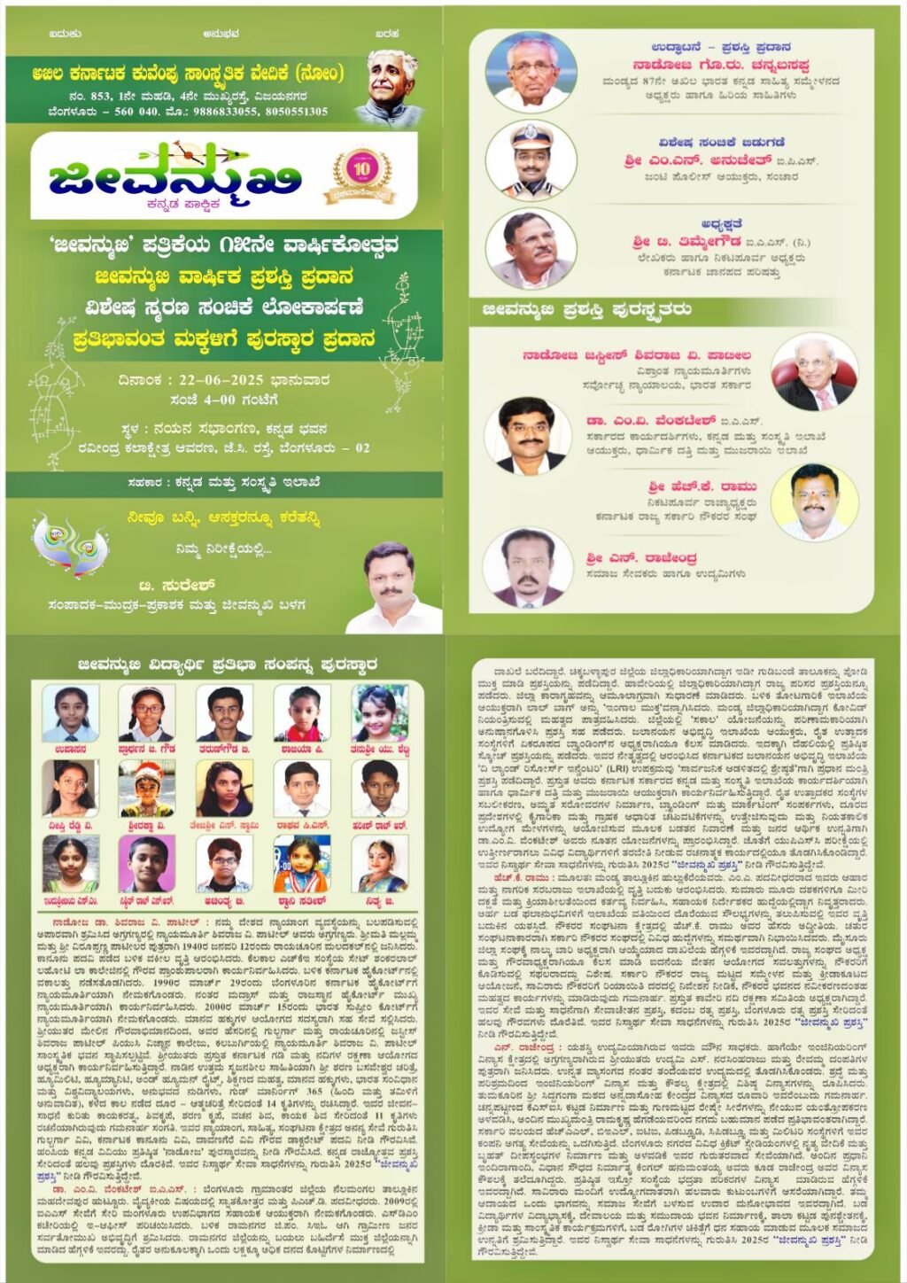 “ಜೀವನ್ಮುಖಿ” ಪತ್ರಿಕೆಯ 15 ನೇ ವಾರ್ಷಿಕೋತ್ಸವ , ವಾರ್ಷಿಕ ಪ್ರಶಸ್ತಿ ಪ್ರದಾನ , ವಿಶೇಷ ಸ್ಮರಣ ಸಂಚಿಕೆ ಲೋಕಾರ್ಪಣೆ , ಪ್ರತಿಭಾವಂತ ಮಕ್ಕಳಿಗೆ ಪುರಸ್ಕಾರ ಪ್ರದಾನ ಸಮಾರಂಭ….