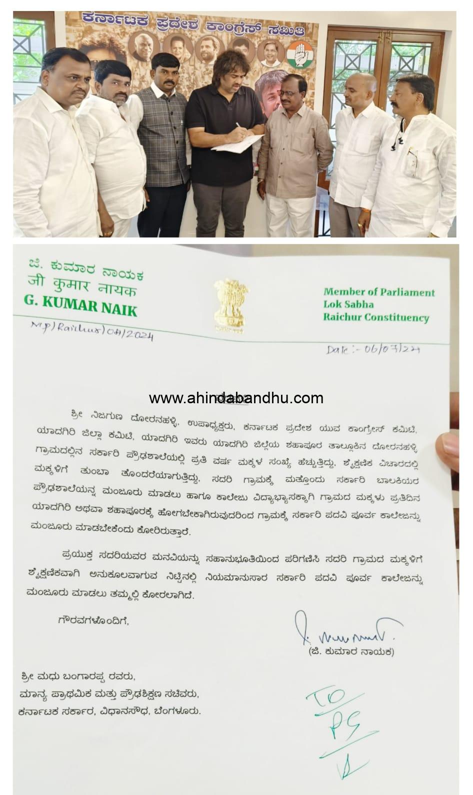 .ಬೆಂಗಳೂರು ಸದಾಶಿವ ನಗರದಲ್ಲಿ ಪ್ರಾಥಮಿಕ ಹಾಗೂ ಪ್ರೌಢ ಶಿಕ್ಷಣ ಸಚಿವರಾದ ಶ್ರೀ ಮದು ಬಂಗಾರಪ್ಪ ಅವರಿಗೆ ಕಾಂಗ್ರೆಸ್ ಯುವ ಮುಖಂಡ ನಿಜಗುಣ ದೋರನಹಳ್ಳಿ ಬೇಟಿ ಮಾಡಿ, ಯಾದಗಿರಿ ಜಿಲ್ಲೆ ಶಹಾಪೂರ ತಾಲೂಕಿನ ದೋರನಹಳ್ಳಿ ಗ್ರಾಮ ಹೋಬಳಿ ಕೇಂದ್ರ ವಾಗಿದ್ದು ದೋರನಹಳ್ಳಿ ಗ್ರಾಮದಲ್ಲಿ ಐದು ಸರ್ಕಾರಿ ಪ್ರಾಥಮಿಕ ಶಾಲೆ ಒಂದು ಸರ್ಕಾರಿ ಪ್ರೌಢ ಶಾಲೆ ಇದ್ದು ಸರ್ಕಾರಿ ಪ್ರೌಢ ಶಾಲೆಯಲ್ಲಿ ಸುಮಾರು 700ಕ್ಕೂ ಹೆಚ್ಚು ಮಕ್ಕಳ ಸಂಖ್ಯೆ ಇದ್ದು ಈ ಶಾಲೆಯಲ್ಲಿ ಎ ಬಿ ಸಿ ತರಗತಿ ಮಾಡಿದ್ದು ಮತ್ತು ಈ ಶಾಲೆಗೆ ಸುತ್ತಮುತ್ತಲಿನ ಗ್ರಾಮಗಳಿಂದ ಅಂದರೆ ಗುಂಡಳ್ಳಿ ಗುಂಡಳ್ಳಿ ತಾಂಡ ಇಬ್ರಾಹಿಂಪುರ ಹಬ್ಬಳ್ಳಿ ಹುರಸಗುಂಡಗಿ ಬಿದರಾಣಿ ಮತ್ತು ವಿವಿದ ಗ್ರಾಮಗಳಿಂದ ದಿನಾಲೂ ಮಕ್ಕಳು ದೊರನಹಳ್ಳಿ ಪ್ರೌಢ ಶಾಲೆಗೆ ಬರುತ್ತಿದ್ದು ಶೈಕ್ಷಣಿಕವಾಗಿ ತುಂಬಾ ತೊಂದರೆಯಾಗುತ್ತಿದೆ ಪ್ರೌಡ ಶಾಲೆ ಮುಗಿಸಿ ಮುಂದಿನ ವಿದ್ಯಾಬ್ಯಾಸ ಮಾಡಲು ಗ್ರಾಮದಿಂದ ದಿನಾಲು 300 & 400 ಮಕ್ಕಳ ಯಾದಗಿರಿ ಶಹಾಪೂರ ಸುರಪೂರಕ್ಕೆ ಹೋಗುತ್ತಿದ್ದು ಇದರಿಂದ ಮಕ್ಕಳಿಗೆ ಶೈಕ್ಷಣಿಕ ವಾಗಿ ತುಂಬಾ ತೊಂದರೆ ಅಗುತ್ತಿದ್ದು ಇದನ್ನು ಗಂಬಿರಬಾಗಿ ಪರಿಗಣಿಸಿ ಮಕ್ಕಳ ಶೈಕ್ಷಣಿಕ ಹಿತದೃಷ್ಟಿಯಿಂದ ಸಣ್ಣ ಕೈಗಾರಿಕೆ ಹಾಗೂ ಯಾದಗಿರಿ ಜಿಲ್ಲಾ ಉಸ್ತುವಾರಿ ಸಚಿವರಾದ ಸನ್ಮಾನ್ಯ ಶ್ರೀ ಶರಣಬಸಪ್ಪ ಗೌಡ ದರ್ಶನಾಪುರ ಹಾಗೂ ಯಾದಗಿರಿ ಮತ್ತು ಕಲಬುರ್ಗಿ ಜಿಲ್ಲಾ ಉಸ್ತುವಾರಿ ಸಚಿವರು ಮತ್ತು ಗ್ರಾಮೀಣಾಭಿವೃದ್ಧಿ ಪಂಚಾಯತ್ ಸಚಿವರಾದ ಶ್ರೀ ಪ್ರಿಯಾಂಕ್ ಖರ್ಗೆ ಅವರು ಯಾದಗಿರಿ ವಿಧಾನಸಭಾ ಕ್ಷೇತ್ರದ ಶಾಸಕರಾದ ಶ್ರೀ ಚನ್ನಾರಡ್ಡಿ ಪಾಟೀಲ್ ತುನ್ನೂರ ರವರು ಮತ್ತು ರಾಯಚೂರು ಯಾದಗಿರಿ ಸಂಸದರಾದ ಜಿ ಕುಮಾರ ನಾಯಕ ಅವರು ಕೂಡ ಈಗಾಗಲೇ ಶಿಕ್ಷಣ ಸಚಿವರಿಗೆ ಮನವಿ ಪತ್ರವನ್ನು ಕೂಡ ಕೊಟ್ಟಿದ್ದಾರೆ, ಅದಕ್ಕಾಗಿ ಈ ಎಲ್ಲಾ ಮನವಿ ಪತ್ರಗಳಿಗೆ ದಯಮಾಡಿ ತಾವುಗಳು ಸ್ಪಂದಿಸಿ ನಮ್ಮ ದೋರನಹಳ್ಳಿ ಗ್ರಾಮಕ್ಕೆ ಒಂದು ಕನ್ಯಾ ಪ್ರೌಢ ಶಾಲೆ ಹಾಗೂ ಸರ್ಕಾರಿ ಪದವಿ ಪೂರ್ವ ಕಾಲೇಜು ಮಂಜೂರು ಮಾಡಬೇಕಾಗಿ ಶಿಕ್ಷಣ ಸಚಿವರಿಗೆ ಕಾಂಗ್ರೆಸ್ ಯುವ ಮುಖಂಡ ನಿಜಗುಣ ದೊರನಹಳ್ಳಿ ಮನವಿ ಸಲ್ಲಿಸಿದ್ದಾರೆ.
